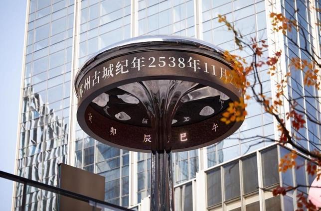 时光广场特别设置《时空坐标》苏州古城纪年装置,它以撑开的环形钟体为形,顶部灯光如古代星宿般缓缓闪烁,下方环形 LED 屏如年轮般记载着自公元前 514 年流淌至今的城史。光幕在金石铭文与苏绣光影间变换,整点鸣响让光阴化作古城的呼吸节律,完成对古城千年脉搏的恒久致敬。