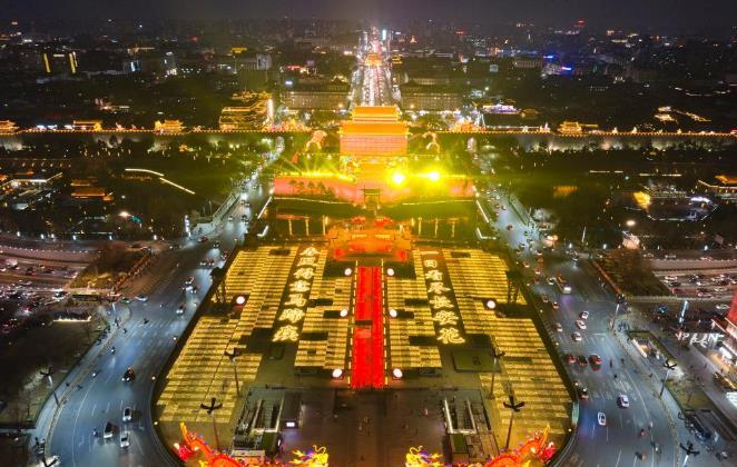1月4日拍摄的西安城墙南门瓮城“长安灯会”景色(无人机照片)。
