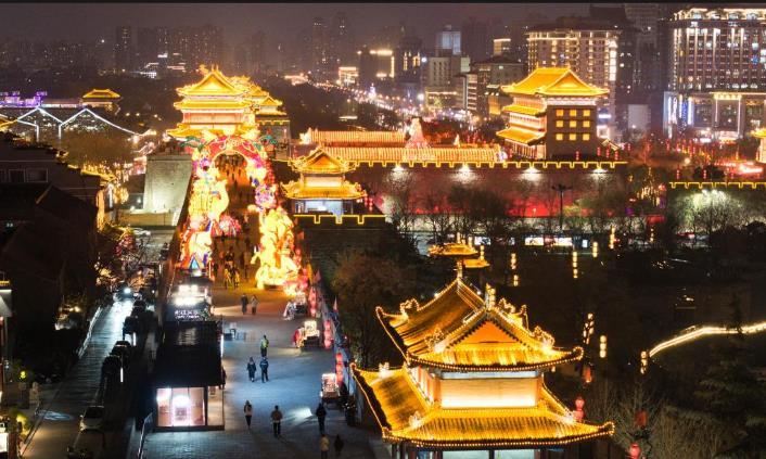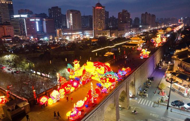 1月4日拍摄的西安城墙南门“长安灯会”景色(无人机照片)。