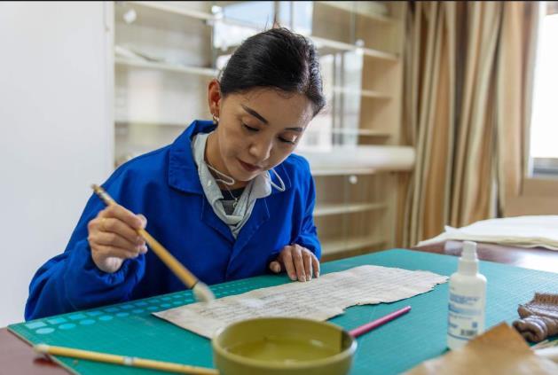 2025年8月13日,西藏自治区古籍保护中心古籍修复员次仁央宗在对古籍进行除霉。新华社记者 旦增尼/玛曲珠 摄