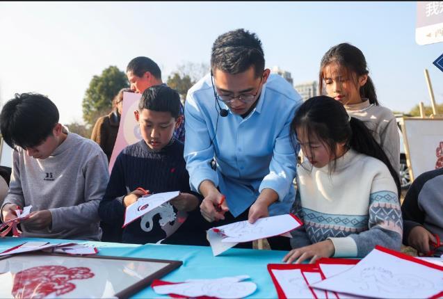 2025年12月6日,浙江省建德市文化特派员王介明(中)在乾潭镇乡村市集活动中带领学生们体验剪纸技艺。新华社记者 徐昱 摄
