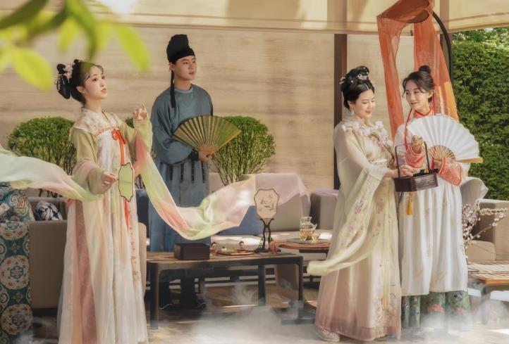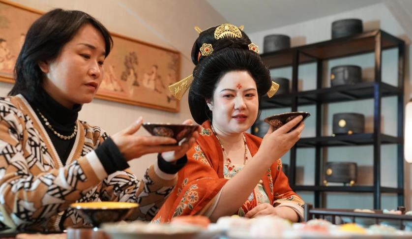 李欢(右二)组织的团队在西安市一家酒店举办唐代上巳节游春主题的品茶活动(2023年3月24日摄)。