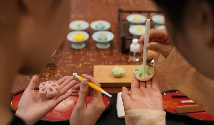 1月9日,一名爱好者在李欢的唐果子制作体验项目中跟着制果师学习制作唐果子。