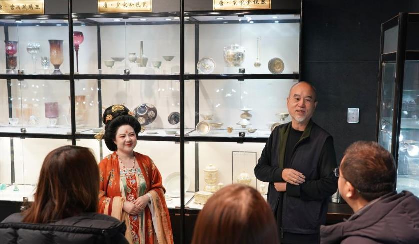 1月9日,李欢(正面左)与法门寺博物馆特邀研究员、中国国际茶文化研究会学术委员王苗(正面右)一起为游客讲解唐代茶具的种类和故事。