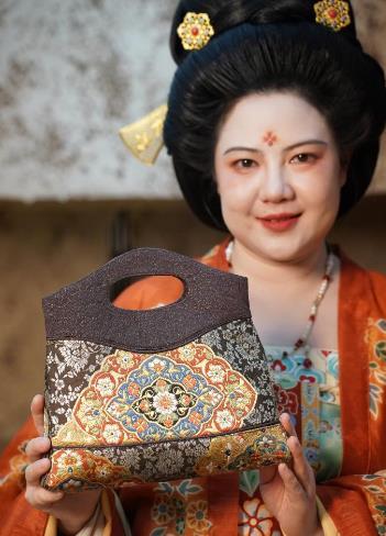 1月9日,李欢在展示她的团队用唐锦工艺制作的文创产品。