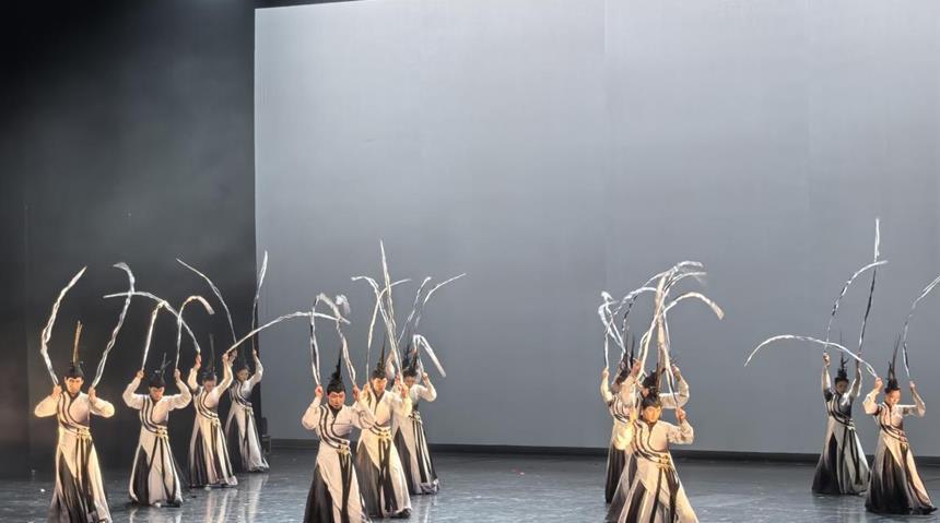 “墨韵入舞”,叙事结构的破格与立新。该剧以《祭侄文稿》的创作心路为情感内核,摒弃线性叙事,让记忆随笔墨在舞台上自然流淌。在舞蹈语汇上,创新运用了“翎子”这一道具。执行导演郝振伟介绍:“‘翎子’的采用既表现了颜真卿笔锋中刀刻般的力量,也象征了他坚韧的人物性格。翎子本身纹路如笔,我们在设计中用它来连接书法与舞蹈的意象。”多媒体与灯光协同,构建出富有历史张力的写意空间。