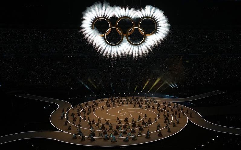 开幕式现场的奥运五环。新华社记者 程敏 摄