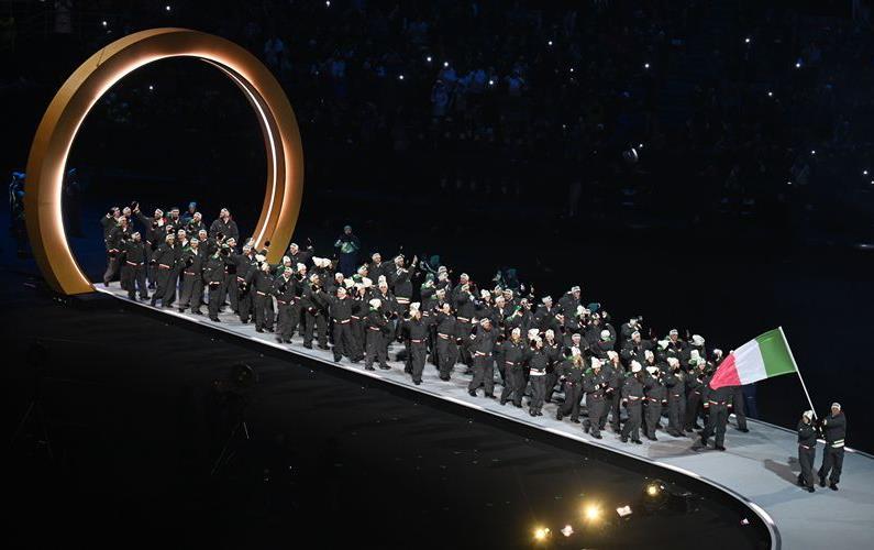 2月6日,意大利体育代表团在开幕式上入场。新华社记者 程敏 摄