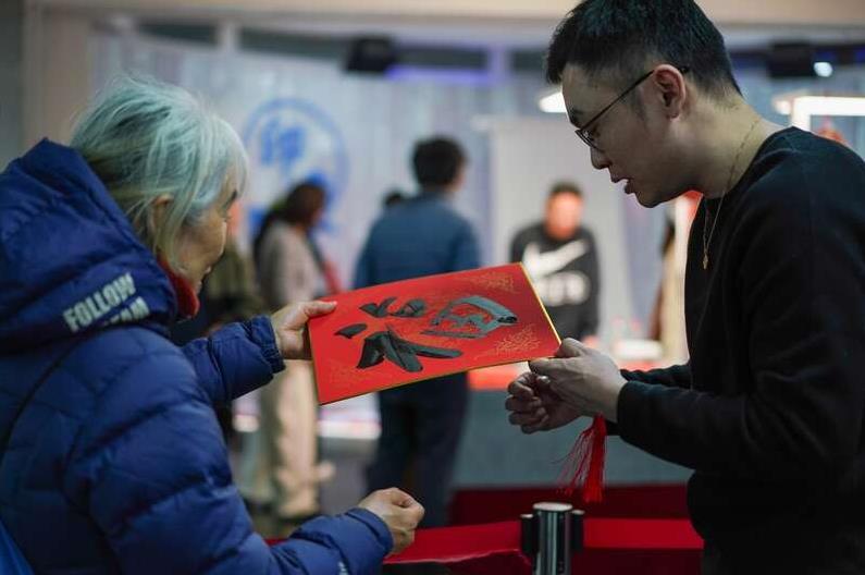 工作人员向读者赠送“福”字。中青在线见习记者 胡庆章/摄