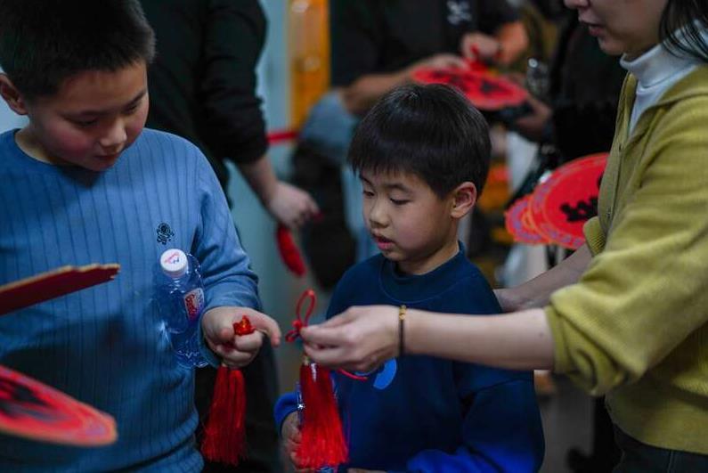 工作人员赠送流苏,读者用流苏装饰“福”字。中青在线见习记者 胡庆章/摄
