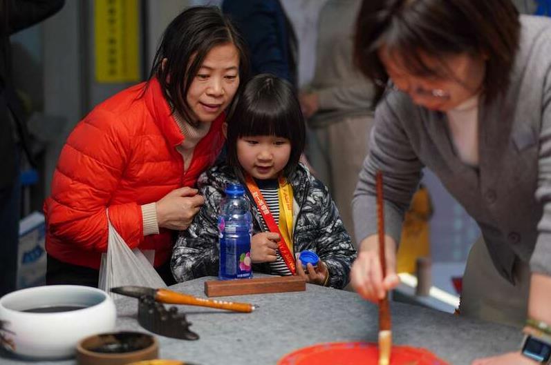 工作人员为小读者书写“福”字。中青在线见习记者 胡庆章/摄