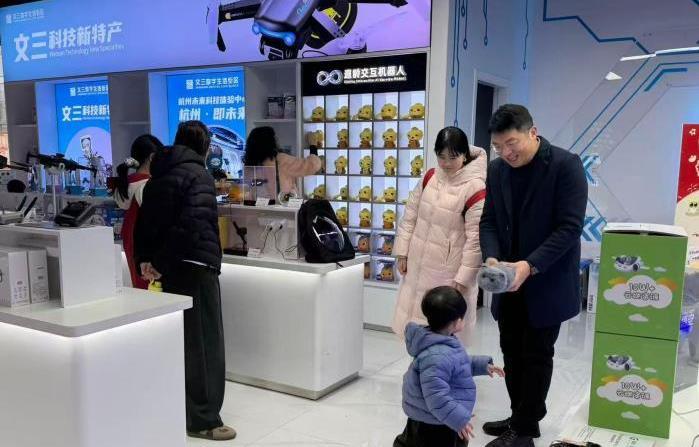 春节期间,在浙江杭州文三数字生活街区的“科技新特产”店内,试戴VR眼镜的年轻人、“骑行”智能行李箱的孩子随处可见,全息显示背包、陪伴机器人等智能产品也迎来了选购热潮。