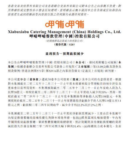 2026年3月6日晚间,港股“连锁火锅第一股”呷哺呷哺(00520.HK)发布2025年盈利预告,交出一份营收下滑、亏损收窄的成绩单。在火锅行业存量竞争、消费回归质价比的大背景下,这份预告既折射出公司结构性调整的阶段性成效,也暴露了规模收缩、品牌承压、连续亏损的长期困境。